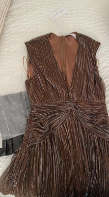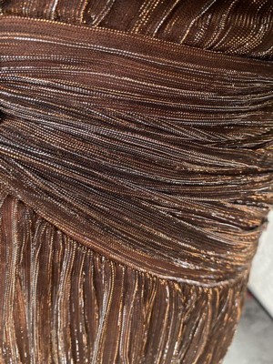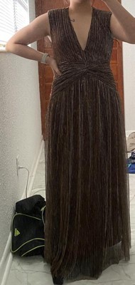 Love this dress! It’s a perfect brown/ bronze with silver sparkles throughout. Not too flashy and just right. I love the length and the cut of the dress. It hits right about my ankle and the bust isn’t too low. I like that it has mini shoulder pads (very small and thin) not noticeable when it is one but makes the dress lay more comfortably. Love it! Very happy with it.