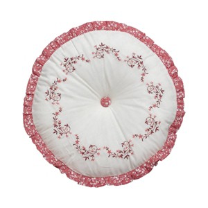 Sweet, round, tufted decorative pillow coordinates with the Caroline Bedspread. The same embroidered red floral scrolls as the bedspread form a circle design on a white ground. The edge is accented with a ruffle in one of the light red floral prints from the top of bed. This tufted pillow is finished with a center button covered in the same light red floral print as the border ruffle. The reverse is white and finished with a ruffle and tufted button in the same light red floral print.