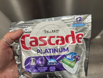 New and Improved Cascade Platinum ActionPacs dishwasher detergent scrubs away dried on food with no pre-washing required. That's because the pod dissolves fast to start cleaning right away, releasing the soaking power of Dawn dishwashing liquid, while food-seeking enzymes latch on and break down food into particles so small they can flow right down the drain. Cascade Platinum dishwashing detergent is formulated to remove visible and invisible residue for gleaming glassware and dazzling dishes. Save up to 20 gallons of water per dishwasher load when you skip the pre-wash and run your dishwasher with Cascade Platinum