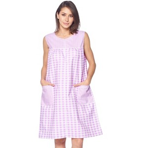 This lightweight Cute and comfortable House coat with Zipper front shift dress Duster for ladies from the Casual Night's Lounge and Sleepwear robes Collection, Thin and light spring/time - summer house robe in gingham checkered and polka dots pattern design, this easy to wear dress bathrobe is made of 55% Cotton, 45% Polyester Seersucker fabric. Housedress sleep dress Features: Pull over tank gown with Half zippper front zip up closure for easy wearing and easy put on/off, flattering round scoop neck, 2 roomy front pockets, hits above the knee approx. 40ö length. This lounge wear muumuu dress has a relaxed comfortable fit and comes in regular and plus sizes S, M, L, XL, 2X, 3X, 4X. versatile multi uses, throw over your clothes as house robe while cleaning, washing and cooking, wear around the house as relaxed home day waltz dress, a nightgown to sleep in the spring and hot summer nights as a sleepshirt dress, This sleep robe gown is perfect to use for maternity, labor/delivery, hospital gown. Makes a perfect Mother's Day gift for your loved ones, mom, older women or elderly grandmother. Even beautiful enough for outside shopping and walking, comfortable enough for everyday use around the house. Please use our size chart to determine which size will fit you best, if your measurements fall between two sizes, we recommend ordering a larger size as most people prefer their sleepwear a little looser. Small: Measures US Size 4-6, Chests/Bust 34-35 Medium: Measures US Size 8-10, Chests/Bust 36-37 Large: Measures US Size 12–14, Chests/Bust 38-40 X-Large: Measures US Size 16-18, Chests/Bust 41-43 XX-Large: Measures US Size 18W-20W, Chests/Bust 46”-48 3X-Large: Measures US Size 22W-24W, Chests/Bust 50”-52 4X-Large: Measures US Size 26-28, Chests/Bust 54”-56