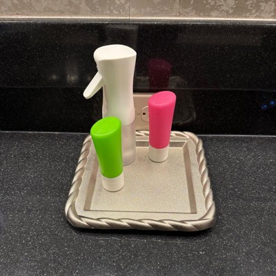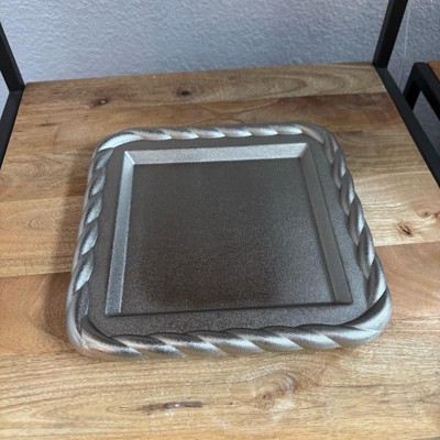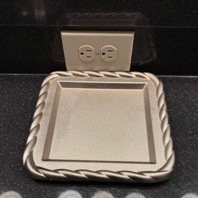 [This review was collected as part of a promotion.] This square decorative tray comes in a very pretty silver color. It has a weaved edge and a leveled or tiered look. Mine came with a few scratches on it, and it was also missing one of the cushion feet on the bottom. Other than that, it’s a very heavy duty and sturdy tray. It can be used to hold almost anything.