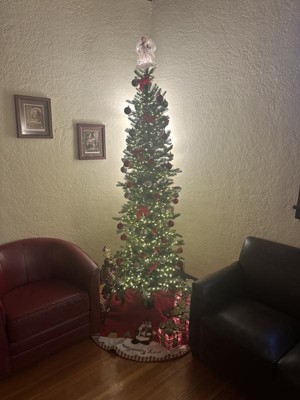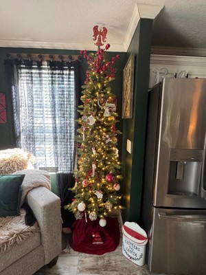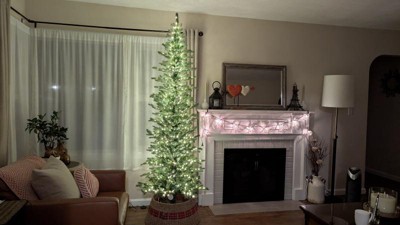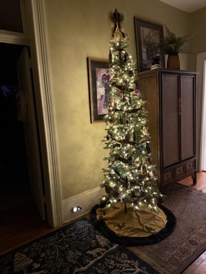 This is a great choice for a home with limited space for a tree. I have it sitting in a 24 inch (24 inch at the bottom) tree collar. I got it after Christmas, but set it up and fluffed it to make sure it was ok. Mine is the fairy lights option. Generous amount of lights, not quite as yellow as incandescent lights, but close. Lights seem to be well dispersed around the tree. Branches are very nice and well placed, this is not designed to be a super full tree, but is a nice approach to a more minamilistic tree without a sparse appearance. A little difficult to fluff because of the lights, but I was happy with the end result. Branches are not hinged, I'm hoping this won't affect the longevity of the tree. I'm not a fan of how the lights connect, the connections need to be hidden towards the back, I also found the connections somewhat confusing, but once lit, it looks great. This is the reason for four stars instead of five). I love the 7.5ft height, really makes you forget that it's a skinny tree! Overall shape of the tree is very nice indeed. I have to disagree with reviews that say the branches look fake, I think they look very realistic, the overall shape of the tree also contributes to a realistic appearance. I'm pleased with my purchase, though I don't think I'd pay full asking price. I will update if I encounter any problems.