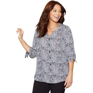 A blouse for all seasons, thanks to its light and breezy georgette fabric. Polished and fluid, this relaxed silhouette floats over the body for a soft, feminine look and feel. FABRIC: Beautifully light and breezy georgette fabric creates that romantic, floating-on-air feeling with a no show-through finish. FIT: Easy, feminine silhouette. Notch neck. Buttonfront. 3/4 sleeves with self-tie cuffs. Bust darts provide shape and the perfect fit. Curved hem with side slits. 100% Polyester. Machine Wash. Imported Plus Size Top. Length: Regular 31", Petite 29". Plus Sizes 0X-6X, Petite Plus Sizes 0XWP-3XWP.