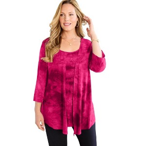The look of a twinset in one easy piece. Cardigan features an attached tank for a lightweight layered look. Soft textured jersey knit has a beautiful scattering of sequins for a style you’ll love to wear all season long over pants or jeans..