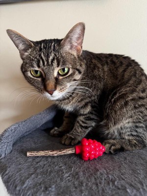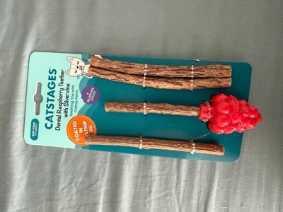 [This review was collected as part of a promotion.] Unfortunately neither of my cats were interested in this product and just looked at it and walked away. They do enjoy catnip by itself, but either these sticks were not coated in the catnip oil enough, or are just not strong enough to engage my cats. I appreciate the design and attempt of the toy and I’m sure other cats may enjoy it, but it was just a miss in our household sadly. The raspberry teether however is cute and has kind of a scent to it, although unsure how to describe the scent exactly, or if it’s supposed to be scented?