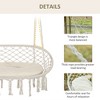 This bohemian-style hanging chair features elegant macrame netting with fringe tassels and a soft cotton cushion for cozy comfort.