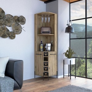 The Shopron corner bar cabinet in aged oak finish combines rustic charm with practical beverage storage.