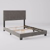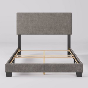 - The bed is wrapped in soft fabric upholstery, combining durability and style.