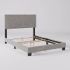 - The bed is wrapped in soft fabric upholstery, combining durability and style.