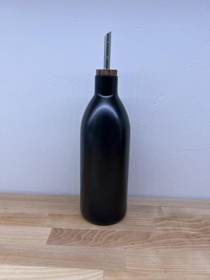 This lovely oil/vinegar bottle is very well made and classic. It has a good spout for pouring out said contents. I like the black color and is just the right size for storing on shelves or counters.