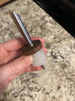 This olive oil/vinegar pour bottle with wood and metal spout is a nice looking, simple bottle. It holds a good amount of oil and the pour isn’t too fast. The skinny metal tube shown in the photo is supposed to be welded/attached onto the main pour spout, but came off during the first use, so I don’t feel that the quality of the bottle is that great.