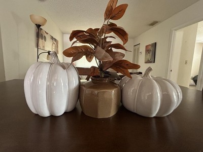 I have been shopping for white ceramic pumpkins awhile now. They are not that easy to find at an affordable price. I purchased both sizes and they fit my seasonal decor perfectly.