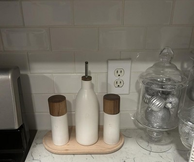 Purchased one set for my stove area and another for my kitchen table. The second set was not molded correctly so the top didn't fit. My grinder was spilling salt everywhere. I love the sleek look and it fits my ktmitchen perfectly I did not like how the molding and fit was not consistent. I have to return the other pair.