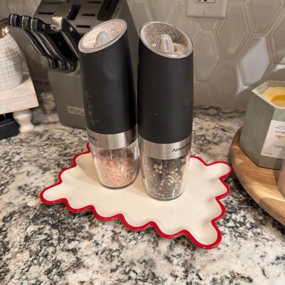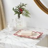 Keep every corner of your home ready for the festive season with the Ceramic Scalloped Soap Tray from Threshold™. This rectangle tray features a scalloped rim in a red hue to add an eye-catching contrast to the ivory backdrop. Made of ceramic, the soap tray can be spot or wipe cleaned for easy maintenance. Add a clear vase and a cotton ball container to complete the coordinated look.