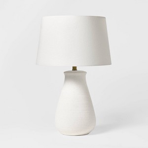 Elevate your lighting with this Ceramic Speckled Table Lamp from Threshold™ designed with Studio McGee. Standing 24.5 inches high, this elegant table lamp features a white fabric drum shade atop a white speckled ceramic base in a graceful gourd shape. The convenient lamp pole rotary dimmer switch offers three-way light settings — low, medium and high — to create the perfect ambiance for any occasion, and the five-foot cord offers flexible placement.