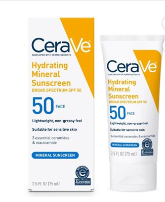 A: Hello RB, Thank you for your interest in CeraVe Hydrating 100% Mineral Sunscreen Body Lotion - SPF 50 - 5 fl oz This sunscreen is a 100%-mineral sunscreen with titanium dioxide and zinc oxide that forms a protective barrier on your skin to help reflect UVA and UVB rays without irritating sensitive skin. Ideal for daily use, it also has three essential ceramides that help restore the skin’s natural barrier and lock in moisture without feeling sticky or heavy. We hope this information has been helpful and that you will try our products soon.