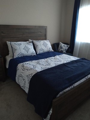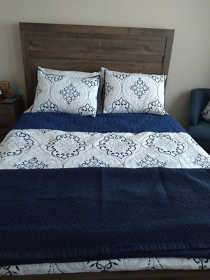 The navy is dark and looks good with the crisp white. I've already washed the quilt and did not have any issues with color bleed. The queen fits my bed just right.