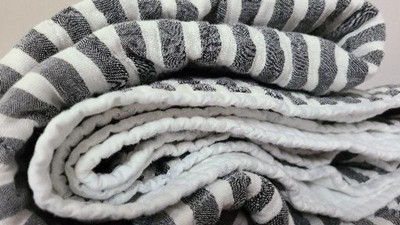 • A: The quilt features vertical gray and white stripes with soft contrast edging for decorative flair.