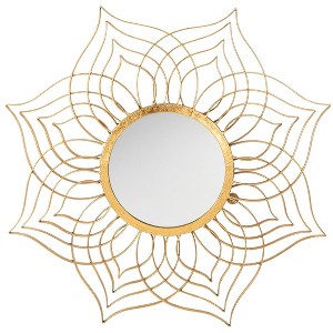 Transform a simple wall into a statement of sophistication. With its mesmerizing golden hue, this mirror adds a warm, inviting atmosphere to your bedroom, hallway, or living area. The reflective glass is set in a secure, artfully wrought iron frame, ensuring both stability and a luxurious aesthetic. Whether you're getting ready for the day or simply enhancing your d�cor, this piece is a serene addition to any interior.