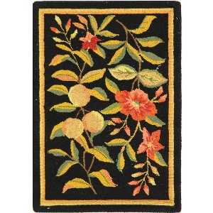 This charming accent rug features a rich black background that beautifully showcases a floral pattern bursting with a variety of colors, including hues of red, pink, purple, green, and beige. The intricate botanical design is timeless and sophisticated, complementing traditional and contemporary decor alike.