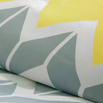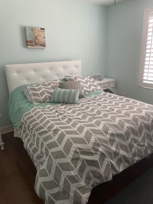 [This review was collected as part of a promotion.] I received the Nadia comforter set, twin size, to try and provide my thoughts. This set was for a twin and had the comforter and a sham and 2 pillow cases. The colors are a nice teal with gray, gray being the primary color with white accenting color l. The comforter is a decent puffiness and soft materals. It washed up very well and didn't appear to clump up and make it appear uneven or bumpy. It makes the bed look nice and finished. The 2 pillow cases appear as a gray chevron almost with white primary colors with a touch of teal. The sham is primarily teal as primary background or.offset color with grey and white chevron stule accents covering the sham. I was pleased with rhe quality, how the items appeared on the bed, and felt it was a very quality item. This, per the tag, has polyester fiber 100% as filling. And per the tag, appears to be a 12x18 inch size. I didn't measure, but it fit twin bed nicely