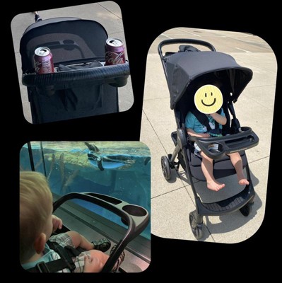Thoughtful design offers a smooth ride with swivel wheels and secure parking with toe-tap brakes. An easy-grip handle and parent tray with two cup holders and zippered storage put comfort and convenience at your fingertips. A large basket stows must-haves down below. A detachable child tray, 3-position backrest, and adjustable UPF 50+ canopy with mesh extension panel help make every ride more comfortable.