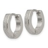 Crafted from durable stainless steel, these 13 mm hoop earrings feature a sandblasted, textured surface that enhances their polished shine with a unique matte contrast. The lightweight 3 mm thickness offers subtle style and everyday comfort, while the hinged huggie design ensures a snug, secure fit. A post, notch, and lock closure adds reliability, making these earrings a standout staple in any jewelry collection.