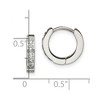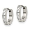 Polished stainless steel hinged hoop earrings measuring 12 mm in length, 13.5 mm in width, and 2.5 mm in thickness. Decorated with 10 round synthetic white cubic zirconia stones. Features a post, notch & lock closure for secure wear. Sold as a single item. Metal Weight 2.2 gram. Timeless Jewelry for Every Day.