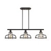 - Industrial-style 3-light island fixture with rustic rubbed bronze finish.