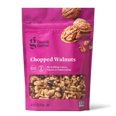 Keep a pack of Chopped Walnuts from Good & Gather™ on hand in your pantry for a recipe-ready addition to enhance everything from baked goods to salads. This resealable package of chopped walnuts contains about 2 cups for snacking out of the bag, folding into baked goods or sprinkling on top of dishes for added crunch. These chopped walnuts contains no artificial colors, flavors or preservatives. Toss some of these chopped walnuts into classic chocolate chip cookies for added nutty flavor and crunch, or use them to finish off a salad of bibb lettuce, apple slices and blue cheese for a delicious lunch.