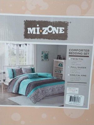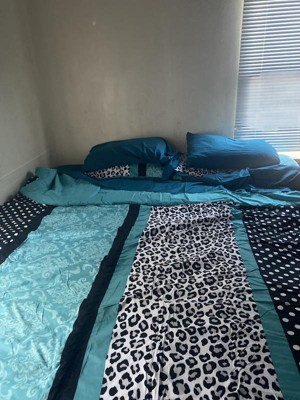 [This review was collected as part of a promotion.] Beautiful, queen size comforter, set. It has some great prints and colors that truly stand out and make a statement in your bedroom. Microfiber comforter is solid turquoise blue on one side, but the other side has a patterned turquoise and white and black cheetah print. It really stands out and looks great in my room. Also comes with two pillow shams and one solid color, turquoise decorative pillow. I love the look and feel of the set. I’ve already washed it in my machine and it did well.
