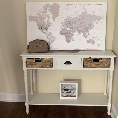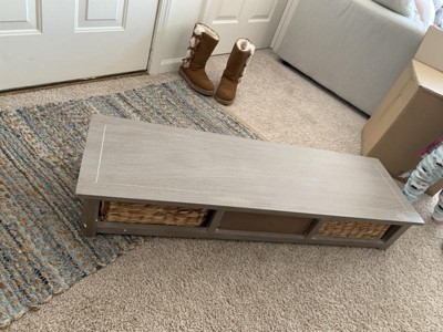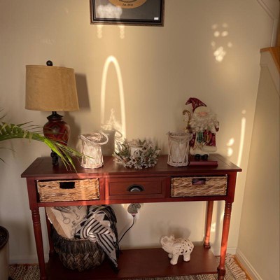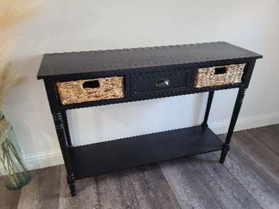 This table looks very nice from the pictures and from the pictures the baskets look great. But it’s not! The wood is very cheap and I ordered the white wood color and it came a dark grey. The baskets for drawers looked dirty and beat up. It is also much smaller than it appears in the pictures. On top of that the one I ordered came damaged. One of the pieces were completely broken off. This console table is not worth the money it’s priced at. If it were cheaper maybe.