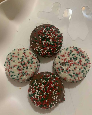 [This review was collected as part of a promotion.] Those festive chocolate covered enrobbed Christmas cookie sandwiches are very sweet. They look pretty and would be a nice looking treat for the holiday season. The milk chocolate ones start melting way faster than the white ones. As I had them shipped they arrived a bit melted. The cookie underneath the chocolate is basically an oreo. I received an incentive to write this review.