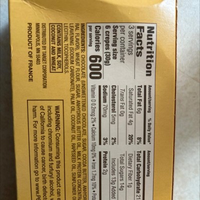 These are delicious! Little bit of chocolate, little bit of sweet. I did submit a question to target asking them if the nutrition label is correct though. It says the box is 3.53 ounces, for the entire package. Even if you had 3.53 ounces of pure butter, the calories will be about 720. This package says that a third of it is 600 cal. There’s no way that that’s possible. If you’re counting calories, maybe skip these just because you can’t know what the accurate number is. But if you’re like me and you don’t really count calories, and you want a nice little sweet treat with your coffee, this is a good one.