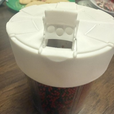 Poor design. The bigger sprinkles don’t fit through the holes. All the holes are the same size, so you can’t rotate the lid as an option. Very poorly designed.