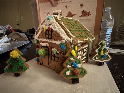 Cute! Not perfect but in this one life on earth what is? Why are we here? What is the meaning of life? This gingerbread house pointed me in the right direction. It was missing the beads, but we were given an extra icing. Was still a fun experience!