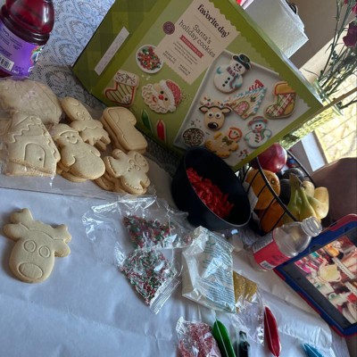 The cookies and icing taste terrible. Too difficult to decorate with icing tubes to get the fine detail they show on the box even though I have experience decorating with icing. It would be easier with simple shapes like ornaments, wreaths, candy canes, and trees. Not enough colored or white icing. Takes too long for one person to decorate all of them, so best done as a group activity.