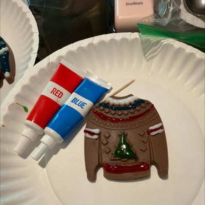 [This review was collected as part of a promotion.] Do yourself a favor and don't get this set. Two of the icings were spoiled and tasted like chemicals. The white one was not white but yellowish. Probably because it was spoiled. The blue and green were okay and usable. The chocolate tastes like normal cheap chocolate. The sweaters already have the patterns on them you just trace it. I thought it was going to be blank and one could add their own designs. I received an incentive to write this review.