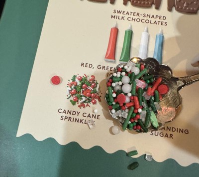 milk chocolate isugar, chocolate liquor, cocoa butter, nonfat milk, soy lecithin. vanilla extract), icing tubes (sugar, shortening [palm oil, mono- and diglycerides, polysorbate 60], water, corn syrup modified corn starch potassium sorbate, salt, natural and artificial flavor, titanium dioxide [color], citric acid, glu- cono delta-lactone, red 3. blue 1, yellow 6) assorted sprinkles (sugar, corn starch, con fectioner's glaze, carnauba wax, yellow 5, red 3 blue 1 red 40, yellow 6, blue 2), gold sanding sugar sugar, confectioner's glaze yellow 5 yellow 6 blue 2. red 40, carnauba wax!' '