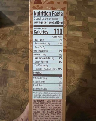 milk chocolate (sugar, cocoa butter, chocolate liquor, whole milk powder, soy lecithin, polyglycerol polyricinoleate, vanilla extract), pretzel rod (enriched wheat flour [wheat flour, niacin, reduced iron, thiamin mononitrate, riboflavin, folic acid], corn syrup, salt, vital wheat gluten, vegetable oil [canola oil, corn oil, soybean oil], baking soda, yeast), toffee bits (sugar, palm oil, butter, almonds, cocoa butter, sunflower oil, salt, artificial flavor, soy lecithin).' '