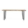 Add a refined industrial charm to your dining area or entryway with this handcrafted acacia wood bench. Featuring a beautiful faux live edge design and sturdy metal hairpin legs, this piece blends natural warmth with modern minimalism. Each bench is uniquely handcrafted, ensuring no two pieces are exactly alike. Its durable acacia wood construction provides long-lasting stability, while the sleek design makes it a stylish and functional addition to any space. Perfect for dining tables, hallways, or cozy nooks.