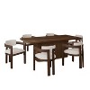The contemporary design showcases clean, open-back aesthetics that complement any dining space with modern sophistication. Constructed from durable solid rubberwood, the chairs offer lasting stability and natural warmth. This dining set features ergonomic chairs with curved U-shaped backrests, deep seats, and armrests for full comfort during long meals. Plush upholstered seating adds extra comfort and style, creating an inviting atmosphere for family gatherings and social occasions around the spacious dining table, making this set both functional and elegant for everyday use.