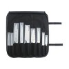 This Chroma knife roll provides safe storage while transporting your high-quality knives. Each pocket is designed to hold each knife securely in place. The knife roll is secured by Velcro to prevents the blades from moving. Features 9 pockets for knives of various sizes. The black, heavy-duty nylon case resists ripping and tearing, and features white stitching as an attractive contrast.