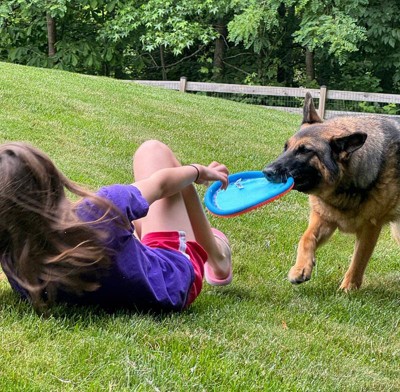 [This review was collected as part of a promotion.] The Paraflight Dog Toy is a fun and engaging frisbee-style toy that really shines when it comes to flight performance. It soars through the air with ease, making it a great choice for active pups who love to run, chase, and catch. The soft, lightweight design is easy on dogs’ mouths and safe for indoor or outdoor play. However, when it comes to durability, it falls a bit short. After just a few enthusiastic play sessions with my dog, the stitching began to fray, and small tears started forming along the edges. While it’s fine for gentle to moderate play, it’s definitely not made to withstand heavy chewing or rough tugging. Sara and Betsy loved to play with it together but after an hour, it had seen better days. If your dog is a light chewer and loves fetch, the Paraflight can still be a worthwhile addition to your toy collection. But if you’re looking for something more rugged, this one may not hold up over time. Overall, 3 out of 5 stars. Great fun—just not built to last.