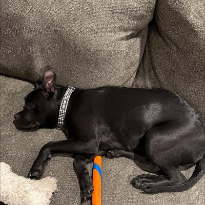 Hi, my name's Mac, I'm only a puppy, I am a black lab mix, and boy, do I love to chew! I've chewed through countless toys, rawhides, etc. This Nerf stick is my favorite- it really does 'STICK' around!