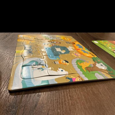 Don't recommend. We thought these puzzles were cute and the perfect number of pieces for my toddler, but they are too flimsy. Once the pieces were remove for the first time, the frame seemed to Wasp and swell, so it's almost impossible to keep the pieces in now which just frustrates everyone involved.