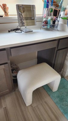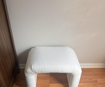 The Cicely Waterfall Ottoman by Threshold is an awesome addition to my chique furniture in my makeup/restroom area. I absolutely love the soft fabric material and how comfortable it is to sit on. It's perfect in size as I can easily slide it under my counter top while at the same time if needed pull it back out and use it to do my makeup. I love how lightweight it is to lift and move around from place to place if needed. I have used it in multiple rooms but found that the makeup restroom area is the best spot for it. It looks very stylish, rectangular with rounded corners. It's got a fuzzy feel to it like a soft plush toy which is super nice. It's super nice also when used in the dressing area or if propping up your feet in the living room. Multiple functions with minimal effort and slick design. It did come in white so cleaning is not super easy as it is spot care only. It's not very wide ~24-1/4" and not very tall so be advised (very low ~17-3/4".) Excellent quality product that should last a few years at least.