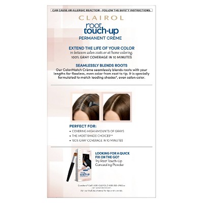 Extend the life of your hair color. Root Touch-Up gives your hair color a boost, covering roots and grays anytime between regular colorings. The targeted Root Creme works in just 10 minutes and matches leading shades -even salon color. Packaging my vary from what is seen on the site but the contents remain the same.