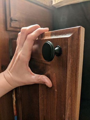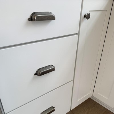 These knobs are the perfect complement to the library bin pulls. Same color, perfect size. Look great installed. Love that the grays look nice with stainless appliances.