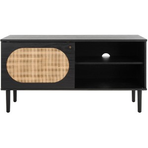 Keep all your media gear organized with our breezy and charming Claude media stand. An oblong cut-out within our clean-lined media stand reveals a rattan mesh for a perfectly refined and charming presence. It adorns a black and natural veneer to bring a warm and relaxed look to your entertainment unit. Our media stand features two open shelves and a sliding cabinet, allowing you to display your entertainment console and DVD collections while hiding all the bulky media equipment behind its elegant facade.